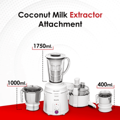 1 unit Motor, 1 Jucier attachment, 1 Blender jar, 1 Dry Grinder jar, 1 Chutney jar