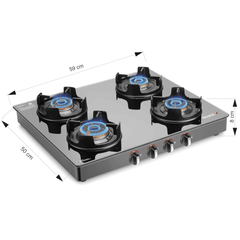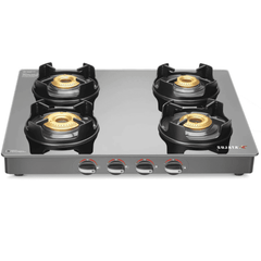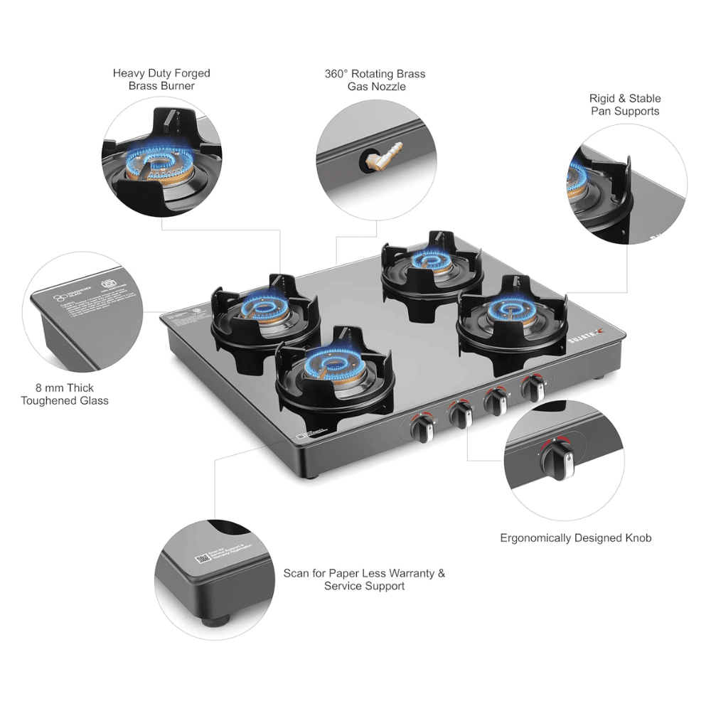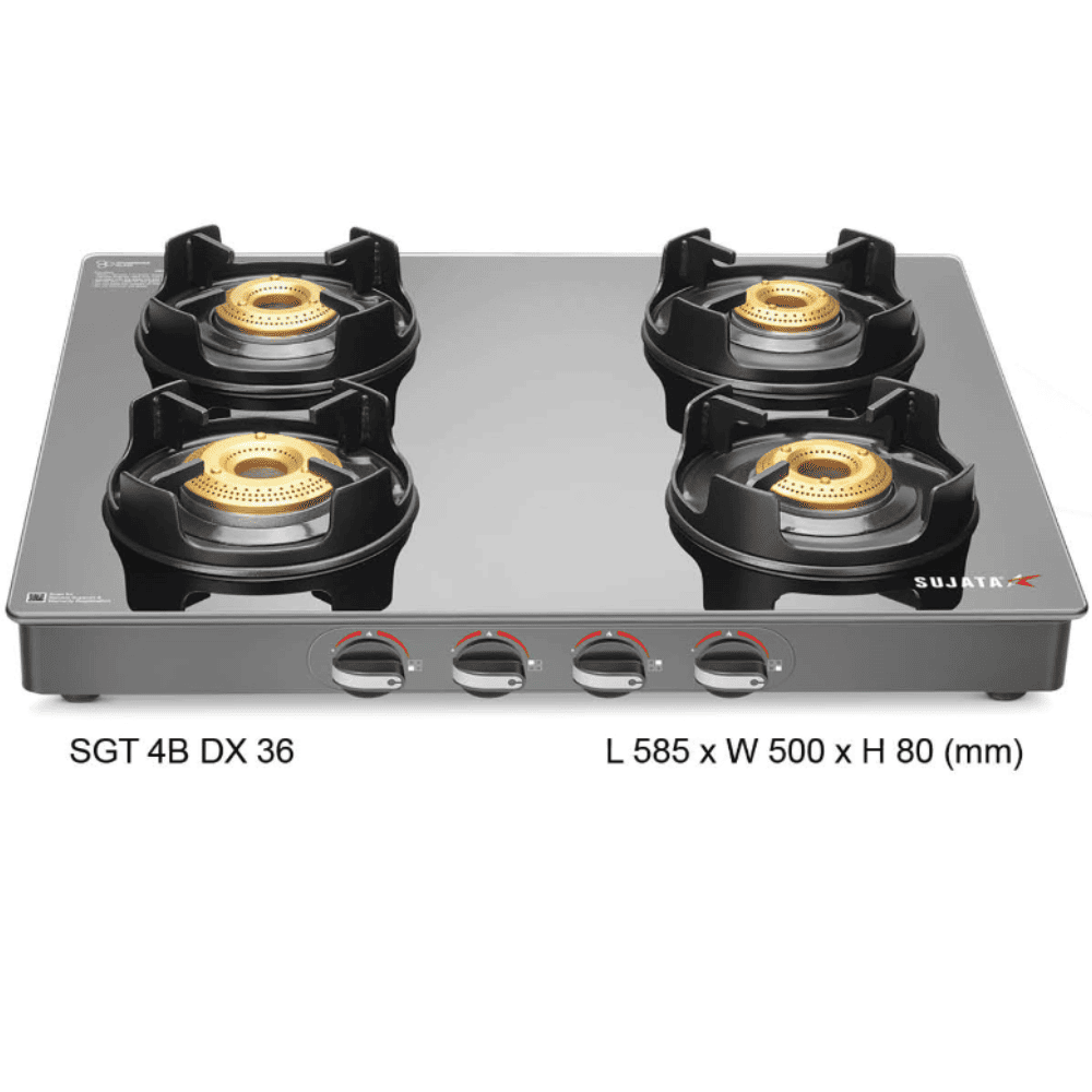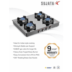 Sujata Cooktop Deluxe AI, 4 Burner Glass Top Auto Ignition Brass Burner Gas Stove (Black)