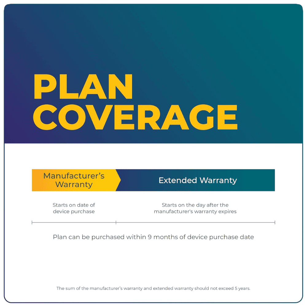 COVERAGE: The plan covers all defects & malfunctions under the original manufacturer’s warranty. The plan starts the day after the manufacturer’s warranty ends. It does not cover physical or liquid damage, accessories, consumables or parts that are not covered under the standard manufacturer’s warranty.