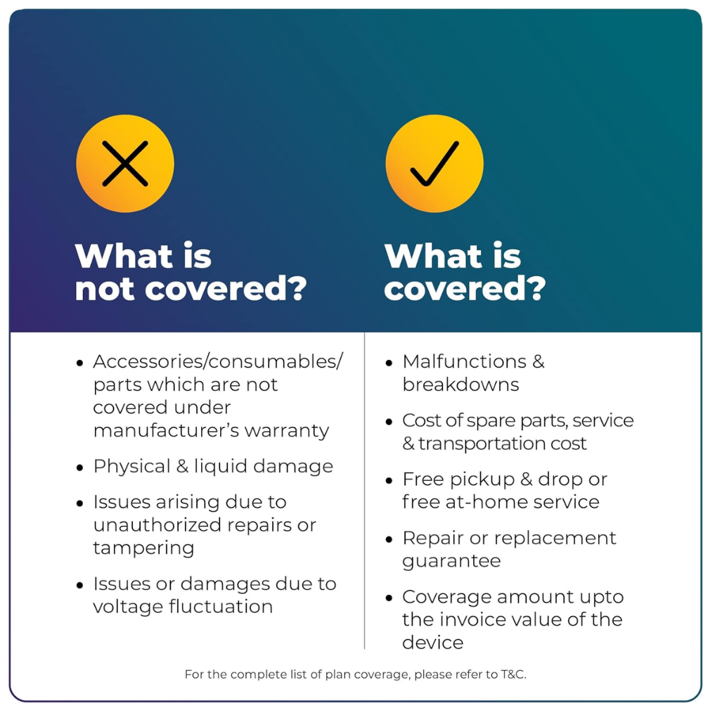 ELIGIBILITY: The plan can be purchased only for new devices and WITHIN 9 MONTHS of device purchase. You can purchase this plan only for devices which have AT LEAST 1-YEAR manufacturer's warranty valid in India. The sum of manufacturer’s warranty and extended warranty CANNOT EXCEED 5 YEARS.