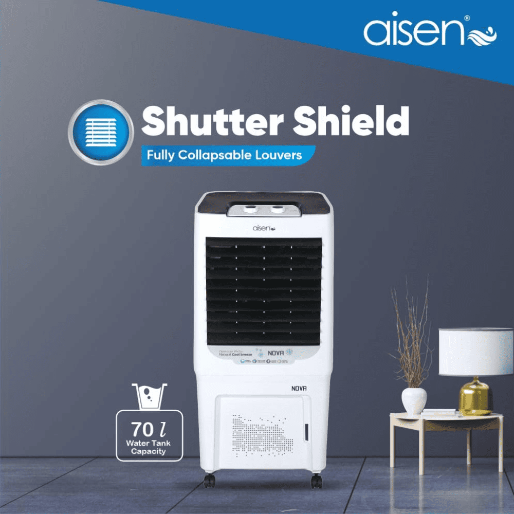 Nova desert coolers comes with higher water tank capacity of 70 L for uninterrupted cooling comfort for long hours. Equipped with metal fan blades, Nova air coolers by Aisen are ideally suited for usage in extreme weather conditions to provide continuous cooling comfort with contemporary and elegant aesthetics.