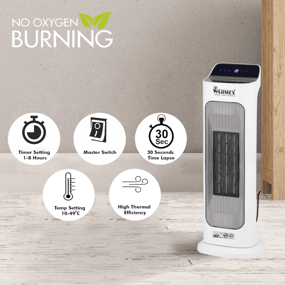 Warmex PTC Room Heater is equipped to be safe from overheating, designed to automatically switch the motor off if it reaches temperatures. Also present is a safety fuse which goes off when the heater reaches ideal temperature. Provides effective heating which gives you enough heat to keep a small to medium sized room warm. The dual functionality of the heater allows it to be used as a fan in warmer weather, making it an appliance that you can use all year around. Equipped with PTC heating element, an unbeatable combination of safety and effectiveness which provides faster, safer and energy efficient heating to enjoy the comforting warmth.