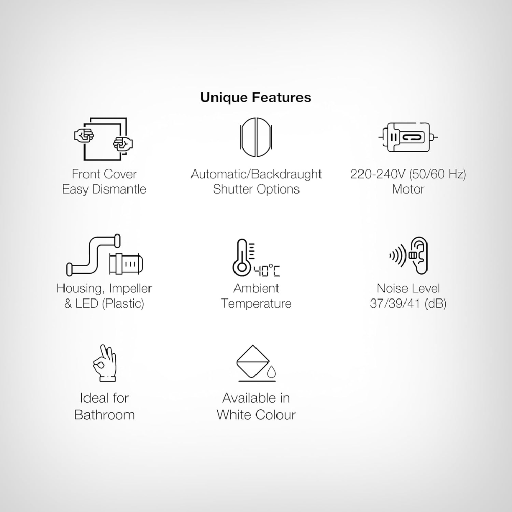 - Energy Efficiency: Proper ventilation provided by exhaust fans can contribute to energy efficiency by reducing the need for air conditioning and preventing the accumulation of heat in enclosed spaces and 220-240V 50/60Hz, motors, insulation class B, and thermal cut out ambient temperature max.40°c.