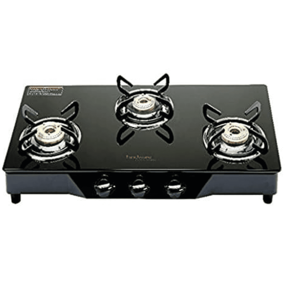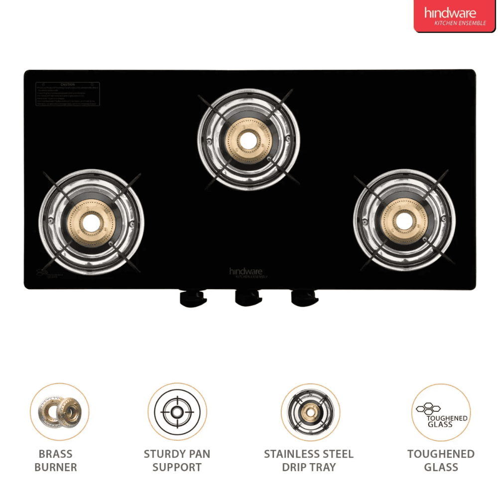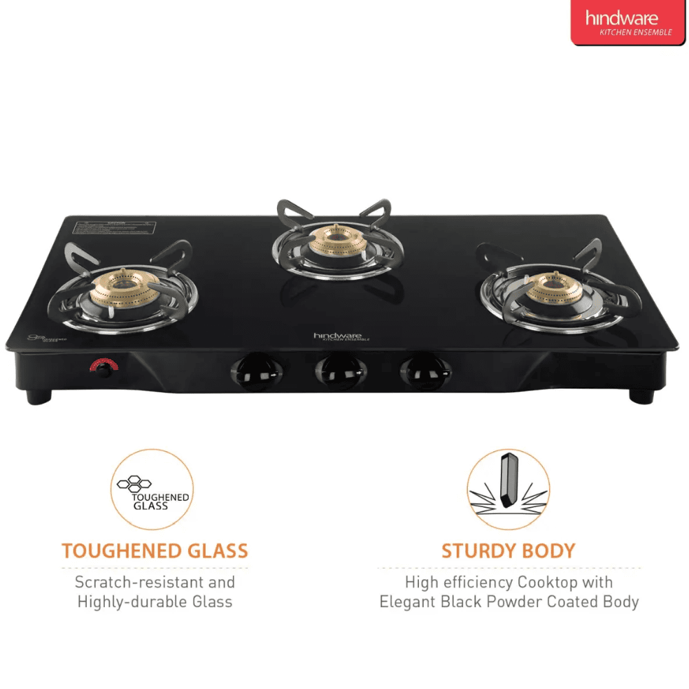 Hindware Cooktop, ARMO GL 3B BLK, 3 Burner Auto Manual Ignition Glass Top Brass Burner 1 Big + 1 Medium + 1 small Gas Stove (Black)