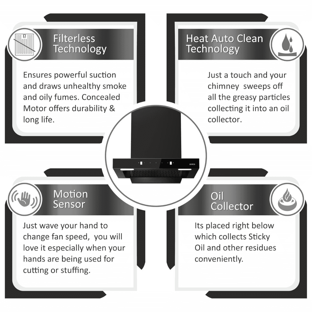 - Elica's Filterless Kitchen Chimneys comes with sealed motor to ensure that oil deposit and water vapour’s does not affect the smooth functioning of the motor.