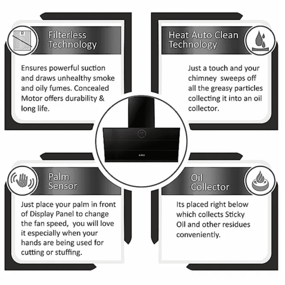 - Elica's Filterless Kitchen Chimneys comes with sealed motor to ensure that oil deposit and water vapour’s does not affect the smooth functioning of the motor.