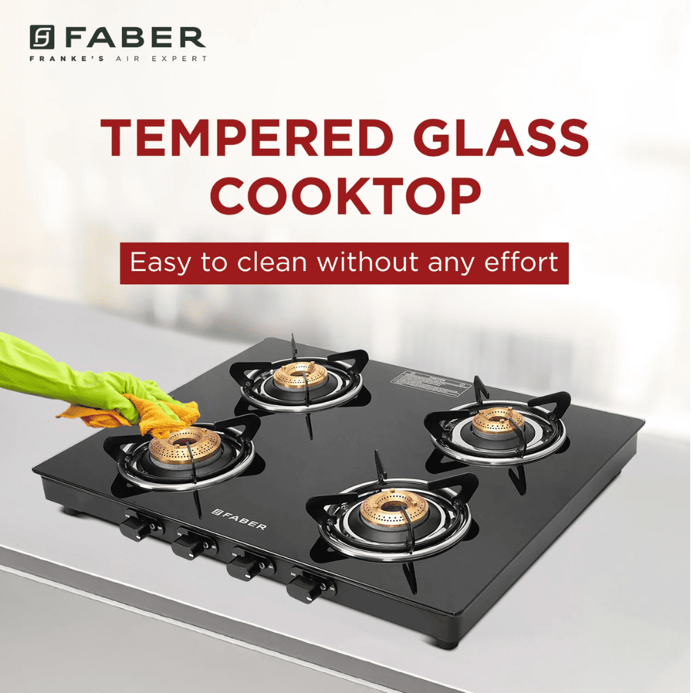 Faber Cooktop, SPARK 4BB BK, 4 Burner Auto Manual Glass Top Brass Burner 1 Big + 2 Medium + 1 small Gas Stove (Black)