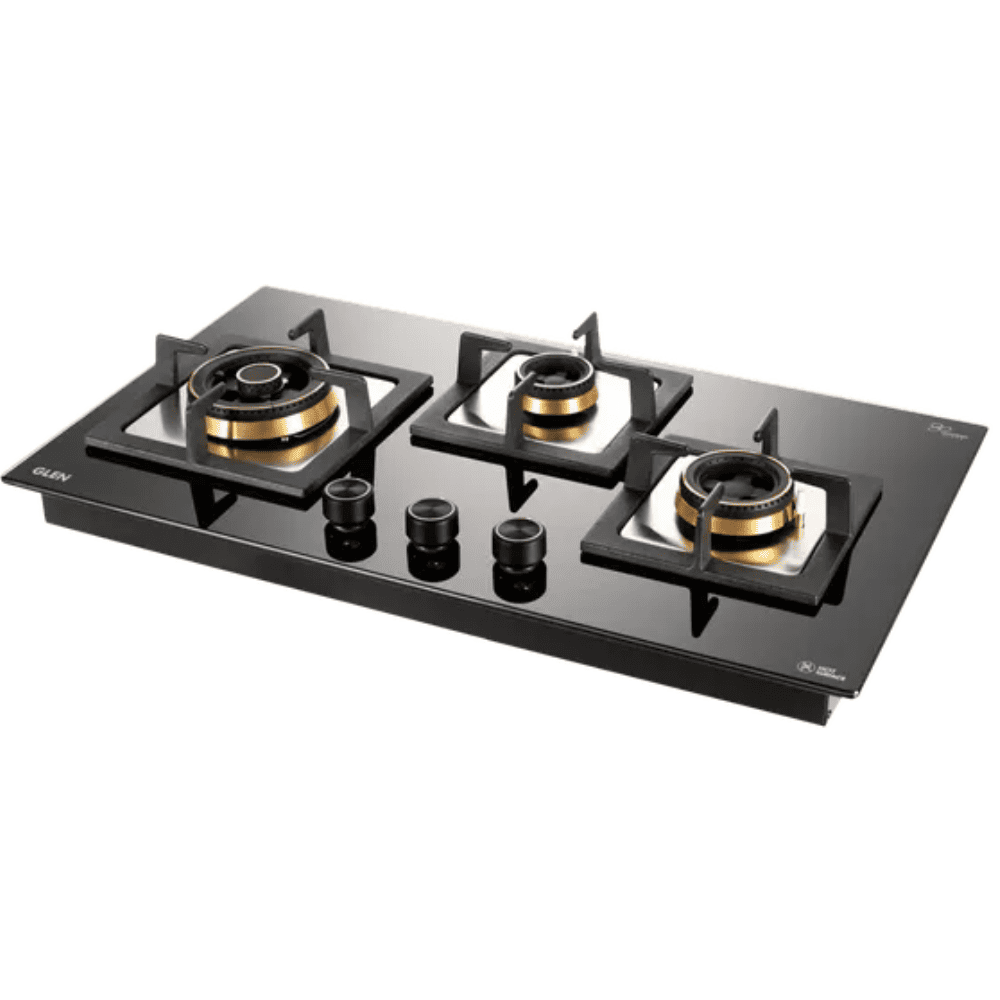 Glen Hob, 1073 SQ HT DB TR, 3 burner 73 cm Auto Electric Ignition Matt Finish Brass Burners 1 Medium +1 Small + 1 High Gas Stove (Black)