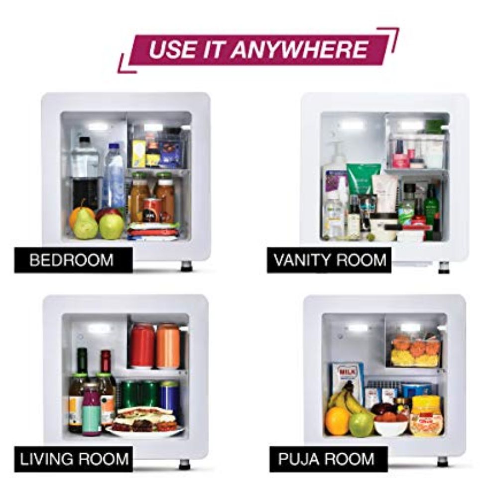 - Mini fridge: Food, beverage and cosmetic cooler with No Defrosting required; well suited for a wide variety of applications - from hotels to homes, PGs to offices and shops, puja rooms to vanity rooms, living rooms to kitchen