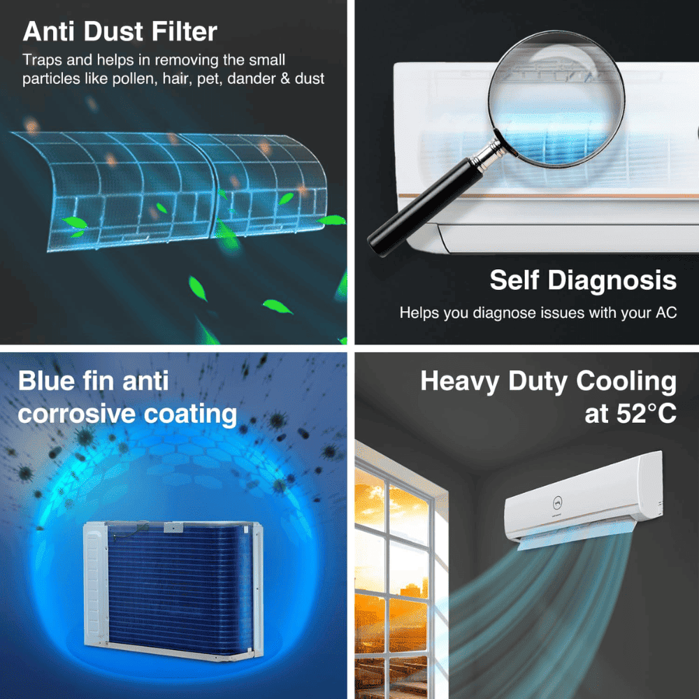 - Capacity (1.5 Ton): Suitable for medium sized rooms (111 to 150 sq.ft), 675 CFM & Ambient Temperature: 52℃