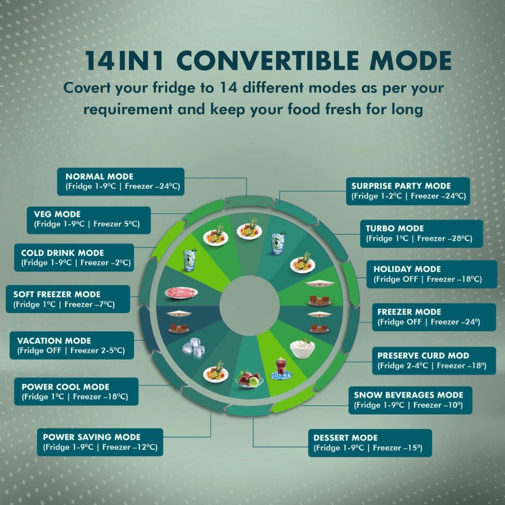 - 14 IN 1 Convertible Modes: Normal Mode|Veg Mode|Cold Drink Mode|Soft Freezer Mode|Vacation Mode|Power Cool Mode|Power Saving Mode|Surprise Party Mode|Turbo Mode|Holiday Mode|Freezer Mode|Preserve Curd Mode|Snow Beverages Mode|Dessert Mode