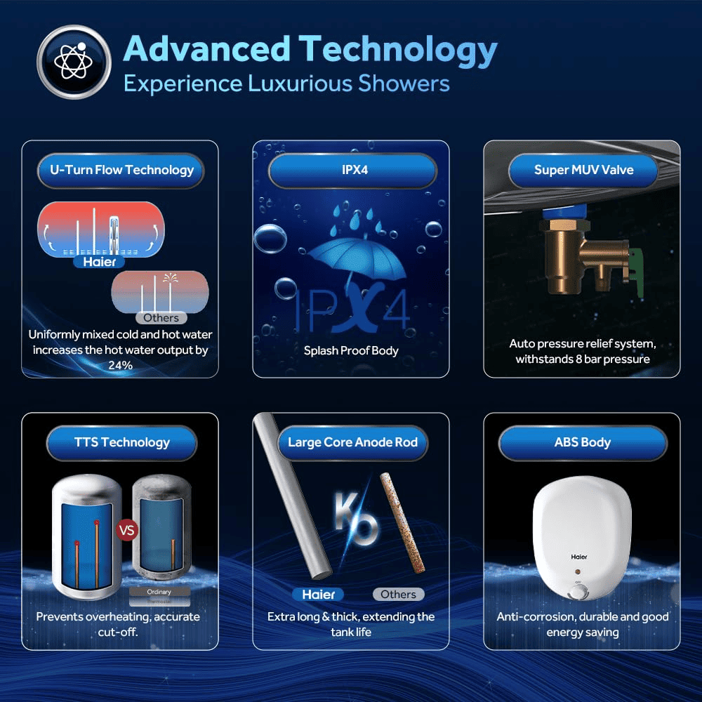 - True Comfort : More fresh shower by U-Turn Flow technology, Experience consistent and luxurious hot water with Haier instant geyser's advanced features. Enjoy the perfect temperature for refreshing showers and relaxing baths.