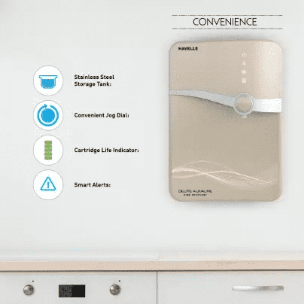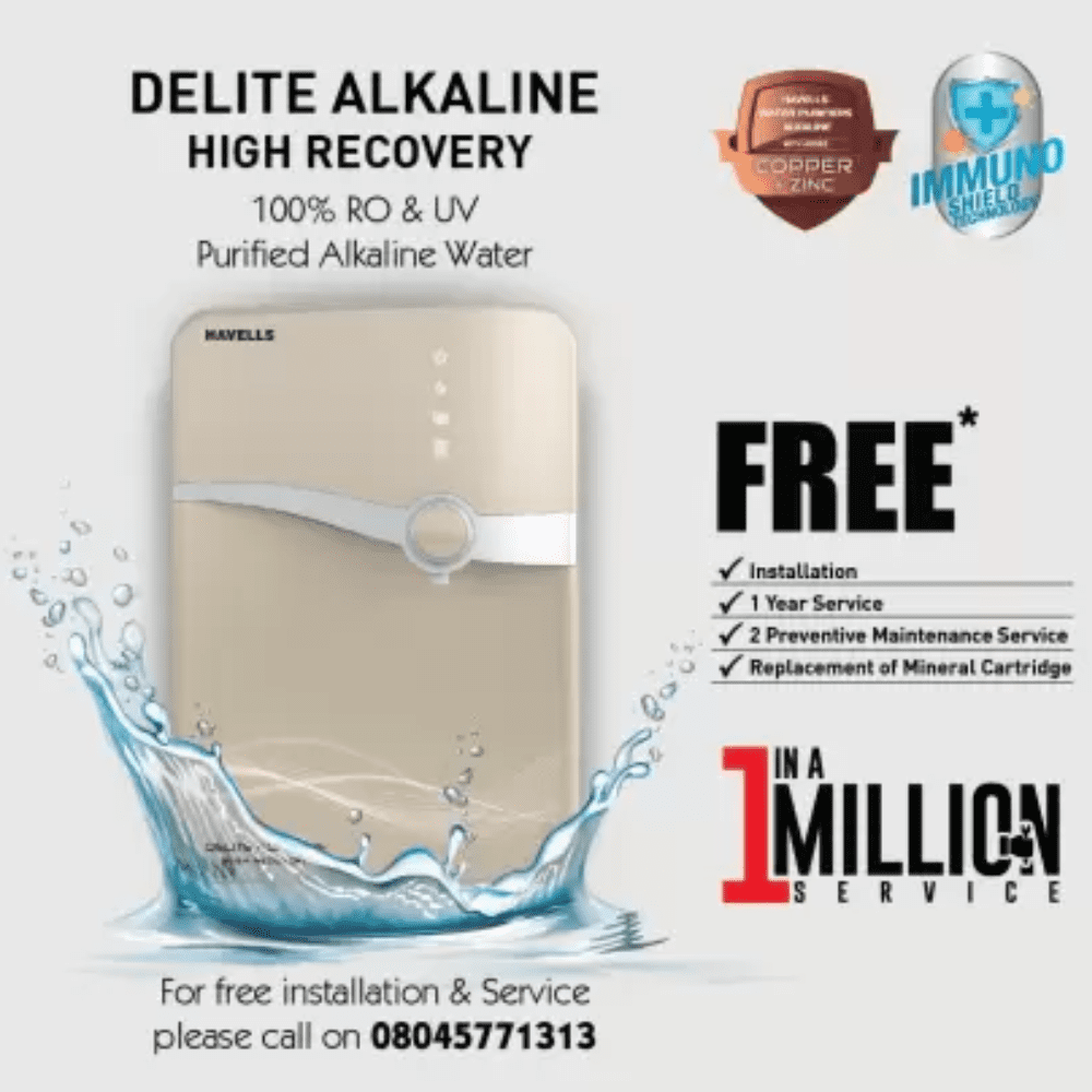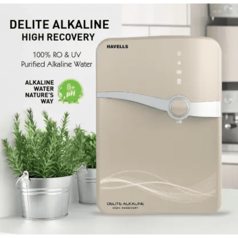 Havells Delite HR, 6.5 Ltrs Alkaline High Recovery RO + ECO + UV Alkaline Water Purifier, Beige & Silver