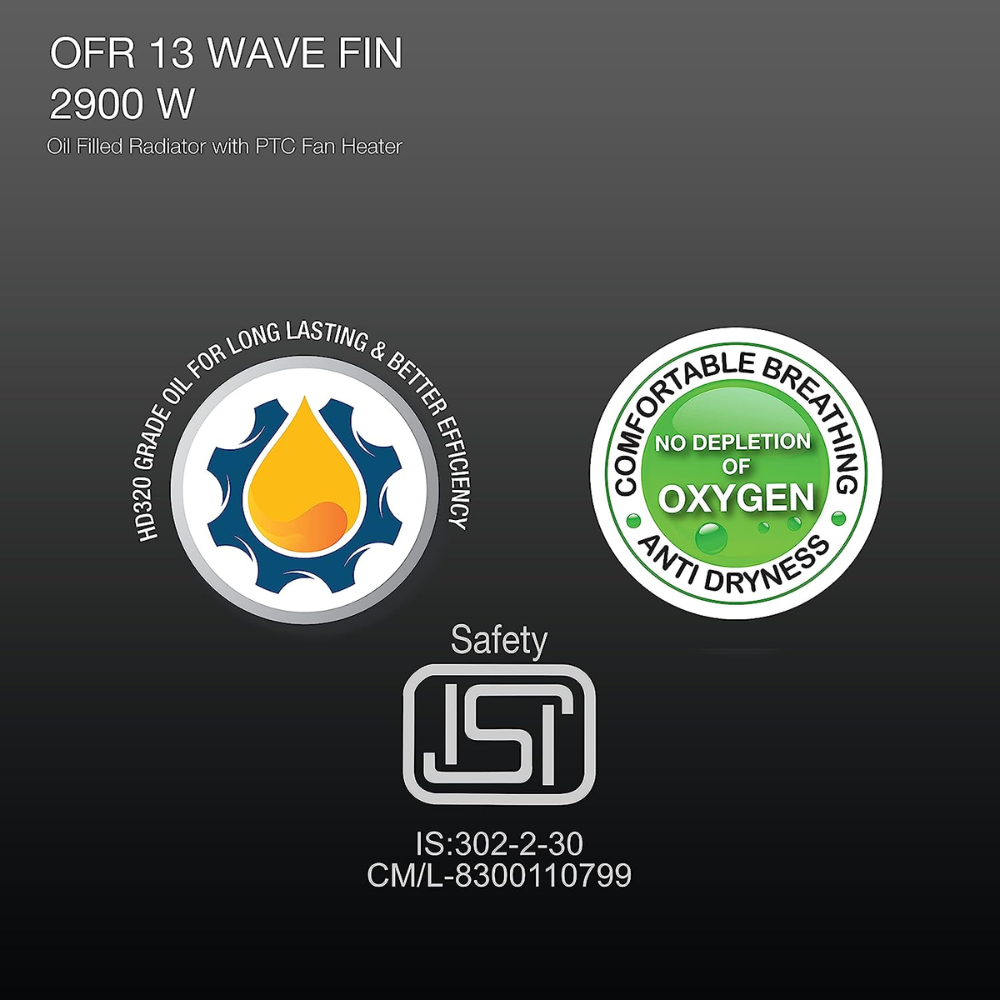 Havells 13 Wave Fins, 2900 Watts Oil Filled Radiators Room Heater with PTC Fan (OFR 13F, Black)