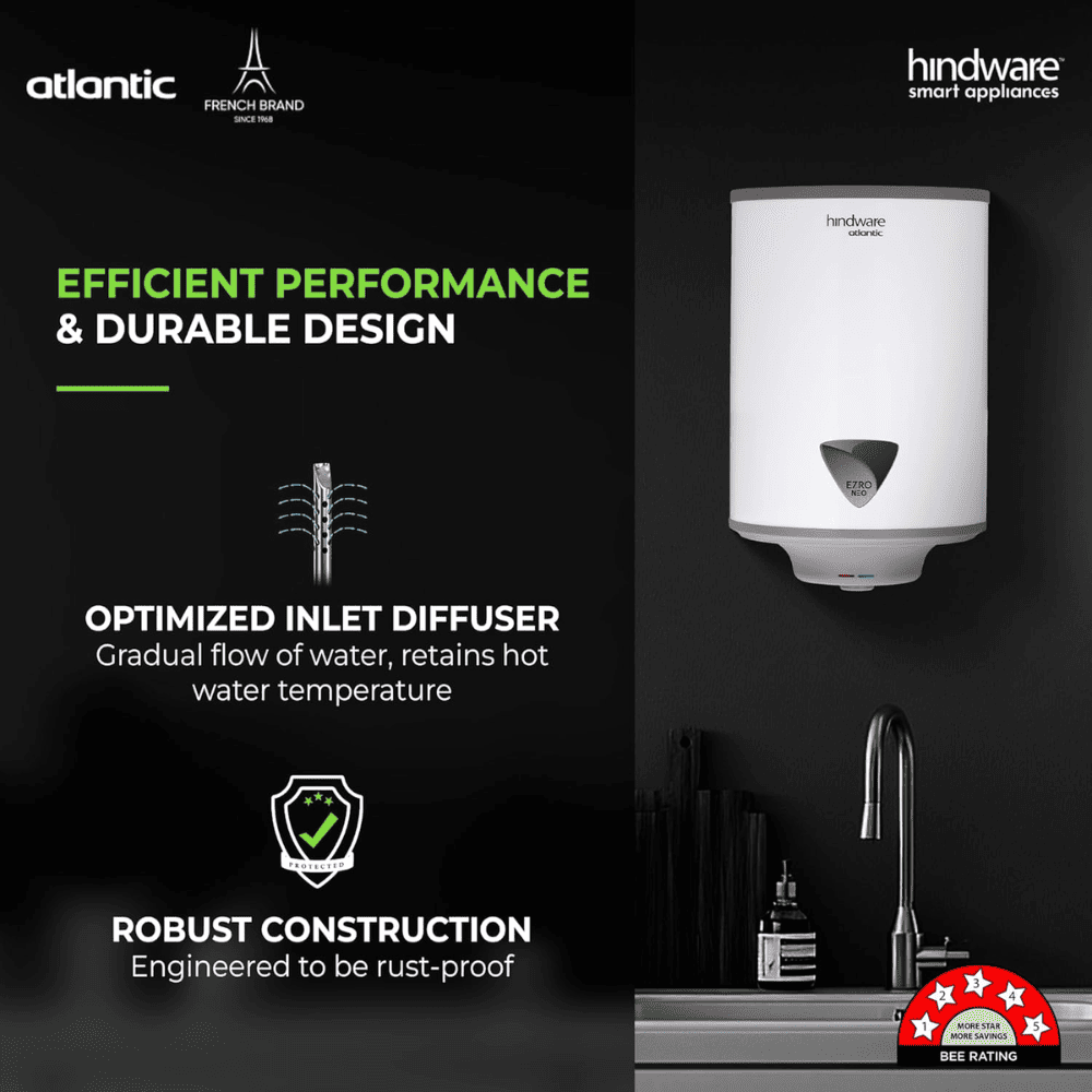 - Design: Hindware Atlantic Ezro Neo water heater comes in an exquisite design and has a robust construction