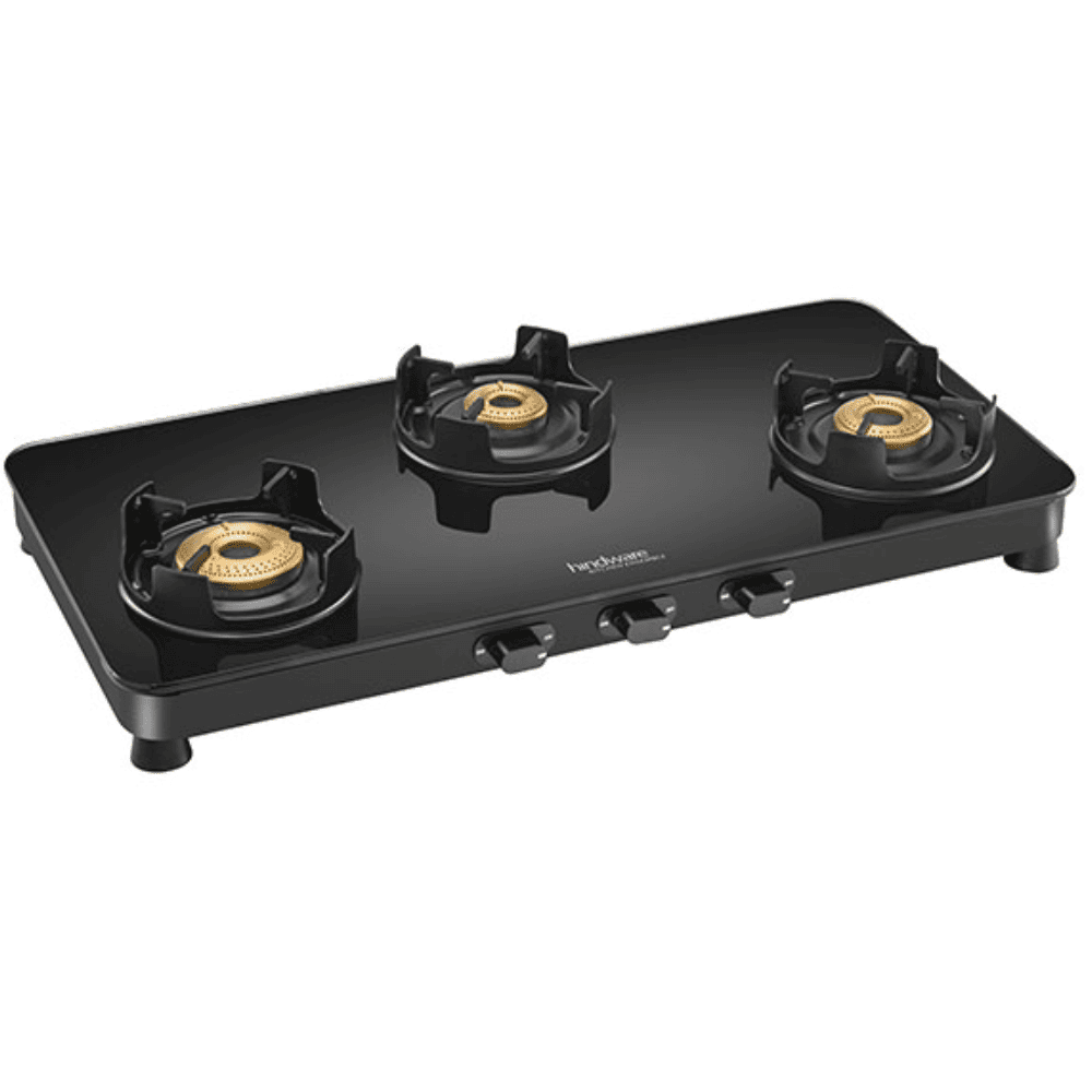 Hindware Cooktop, ALVERIO 3B AI, 3 Burner Auto Ignition Glass Top Forged Brass Burner 1 Big + 1 Medium + 1 small Gas Stove (Black)