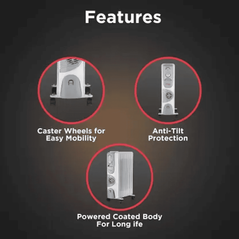 You can keep your room warm with the Hindware Salome Oil-filled Room Heater. Equipped with castor wheels, this room heater can be moved from one room to another without much effort. And, even if it is overturned due to accidental bumps, its anti-tilt protection feature automatically shuts down the machine to ensure your safety. In addition, integrated with a power indicator light, this room heater helps you monitor its operational status. Moreover, its powder-coated body is not just durable but also blends well with your room decor.
