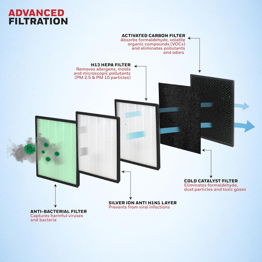 - 5 Stage Filtration process through Anti-bacterial Filter, High Grade H13 HEPA Filter, Silver ION Anti H1N1 Layer , Cold Catalyst and Activated carbon filter