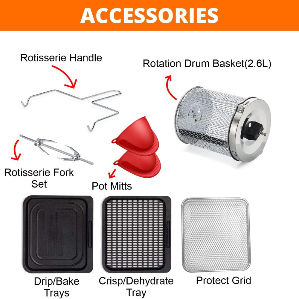 - Warranty : It comes with 2 yearsa number of indispensable accessories like 4.6L Non-Stick Basket with detachable handle, 2.6L Rotation Drum Basket, Crisp Tray, Bake/Drip Tray, Rotisserie Fork Set with handle, 2 Pot Mitts & a recipe booklet.