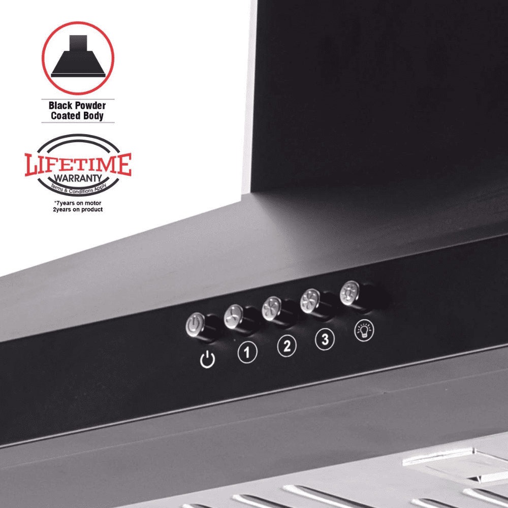 - Size: 60 cm (2-4 burner stove for wall mounted chimneys) | Suction Capacity: 1150 m3/hr (For kitchen size ≅ 175 sqft, medium & heavy frying/grilling)