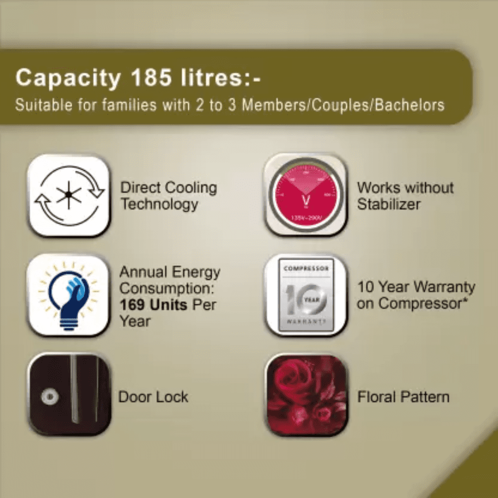 - Capacity 185 liters: Suitable for families with 2 to 3 members and bachelors| Freezer capacity: 16L, Fresh food capacity: 169L