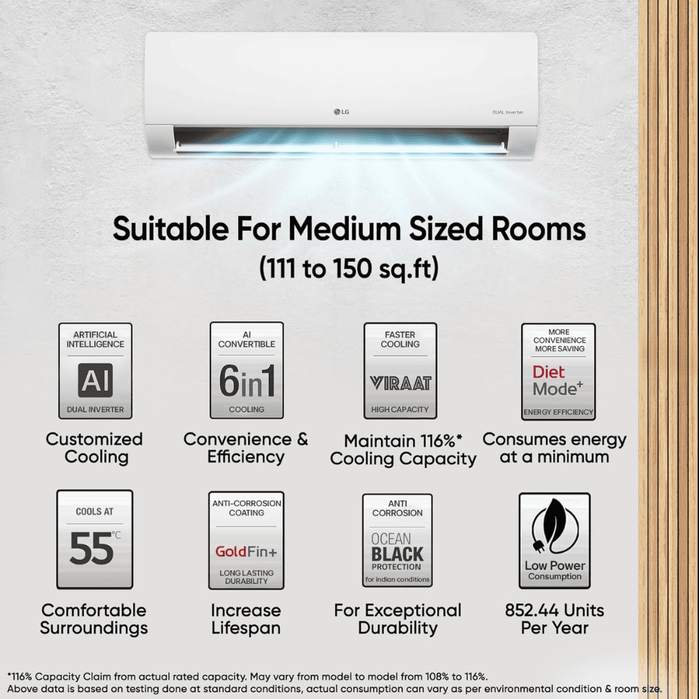 - Dual Inverter Compressor LG Inverter ACs use Variable Tonnage Technology to adjust cooling by controlling compressor speed, ensuring faster cooling initially and energy savings once the desired temperature is reached.