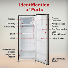 8. Storage or Interior description : Total no. of Compartments - 02 (Freezer & Fridge) - Egg Trays, Chiller / milk or dairy product trays or fresh fruit trays; Drawer | Shelves – 03 Toughened Glass with Frame; Ice Tray, Egg Tray; suitable for large sized utensils sized, medium or small sixed boxes; Spill proof adjustable shelves | Vegetable box (removable) capacity: 21 Ltrs.| Anti-bacterial gasket | 2 ltr. Bottle storage; 4 full + 3 half door basket