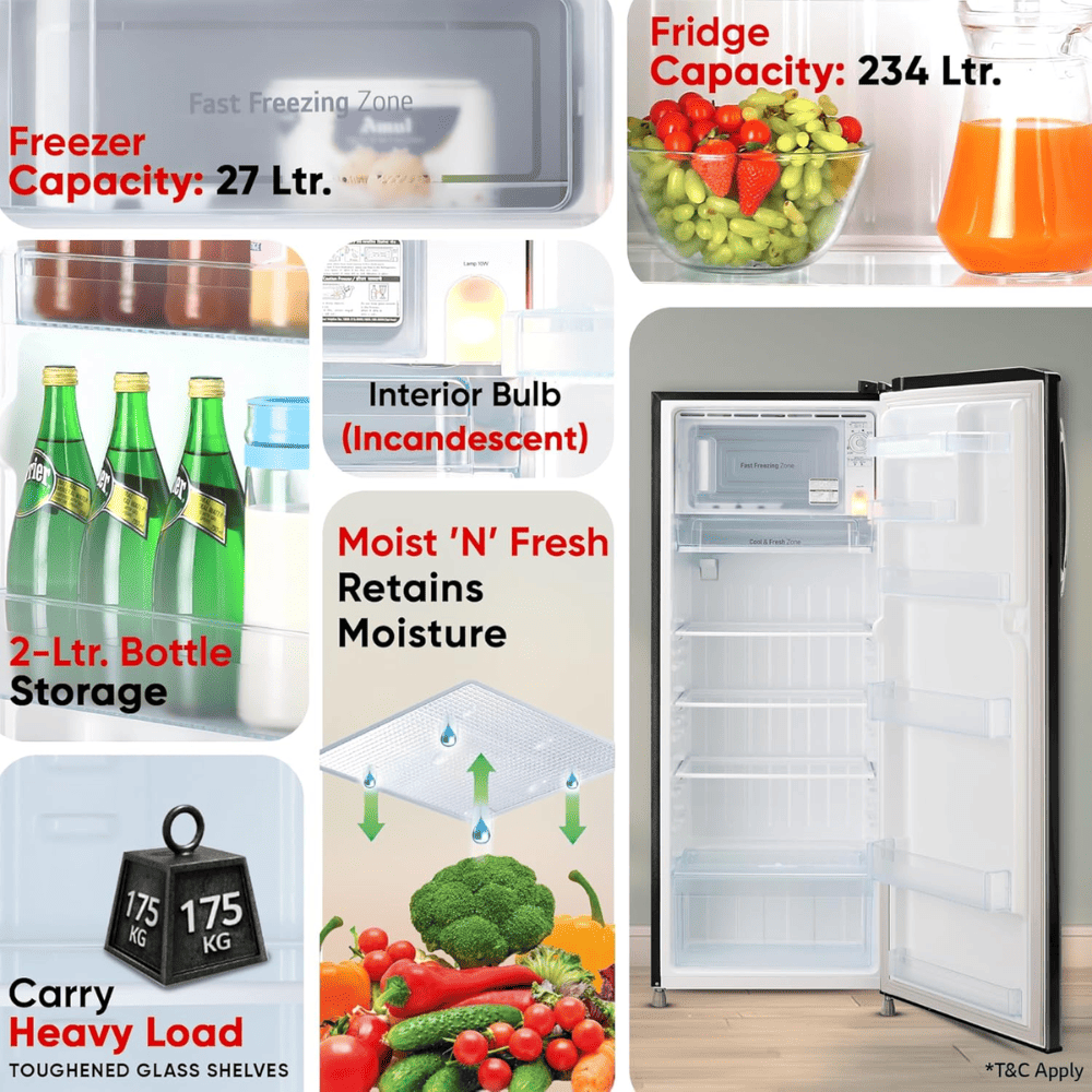 2. Net capacity 261 litres : Suitable for families with 2 to 3 members/ Couples / Bachelors | Freezer capacity: 27 L; Fridge capacity (fresh food): 234 L
