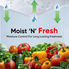 9. Key Features : Knob Control; Works Without Stabilizer (90 V ~ 310 V); Moist ‘N’ Fresh - maintain optimal moisture levels in the vegetable box, preventing fruits and vegetables from drying out and keeping them fresh for longer; Humidity Controller; Lock - Child Safety, enhancing safety and security; Anti-rat bite (Sleeve); Smart Connect; Solar Connect