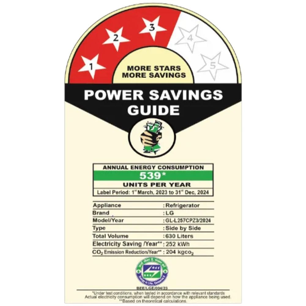 LG 630 Ltrs 3 Star, Inverter Frost Free, Side-by-Side Refrigerator (GL-L257CPZ3)