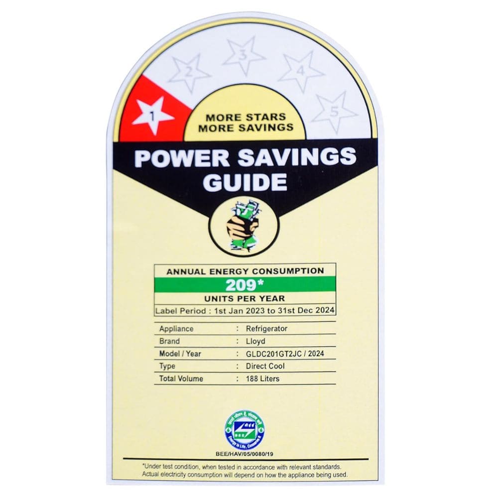 Lloyd 188 Ltrs 1 Star, Inverter Direct Cool, Single Door Refrigerator (GLDC201GIBT2JC)