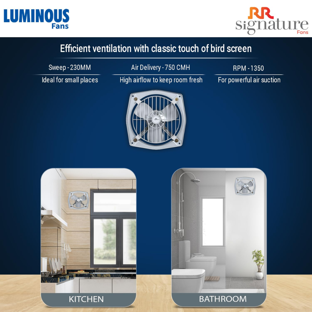 - High Air Thrust: Intricate engineering of this fan allows it to produce an air delivery rate of 750 CMH to draw out odor and stale air quickly