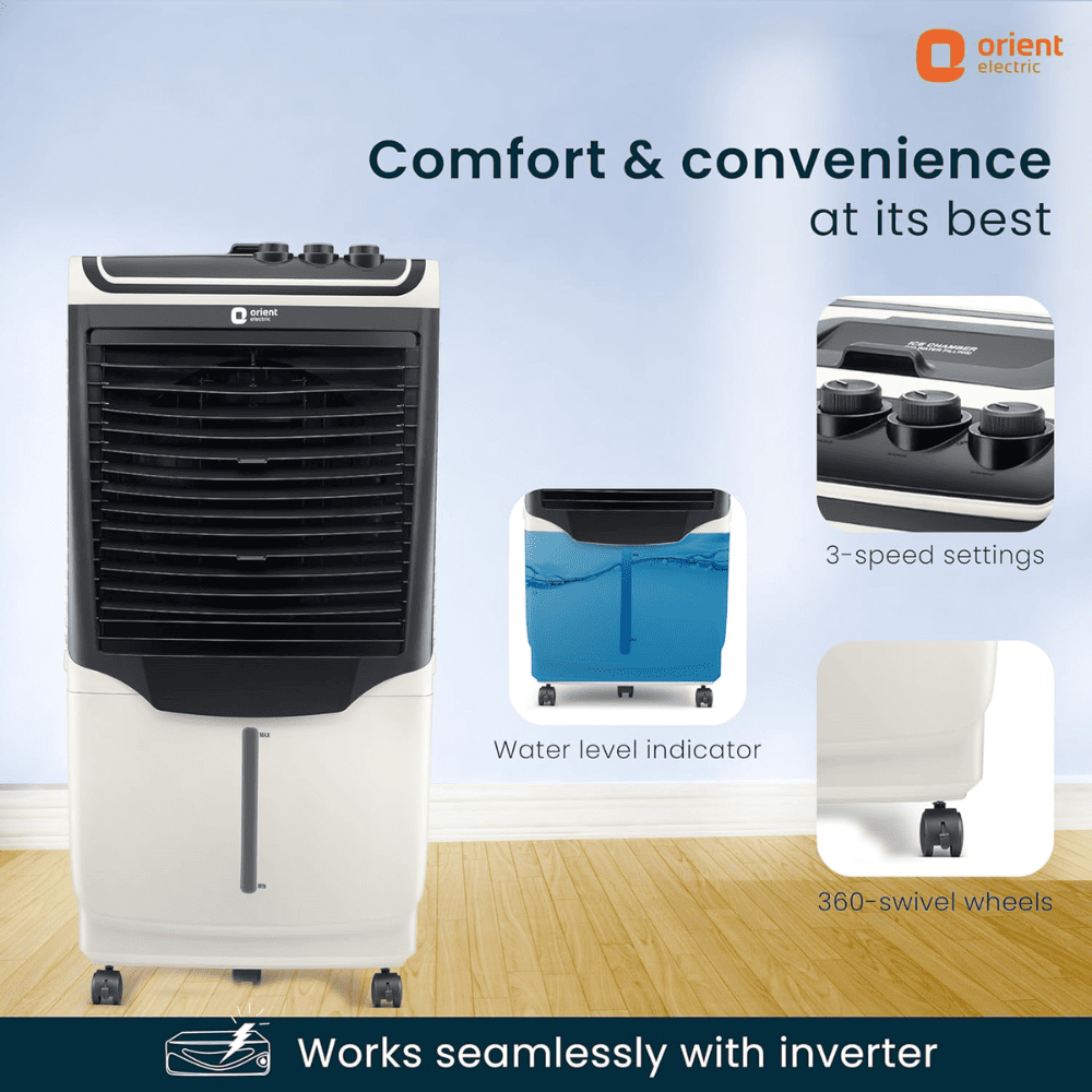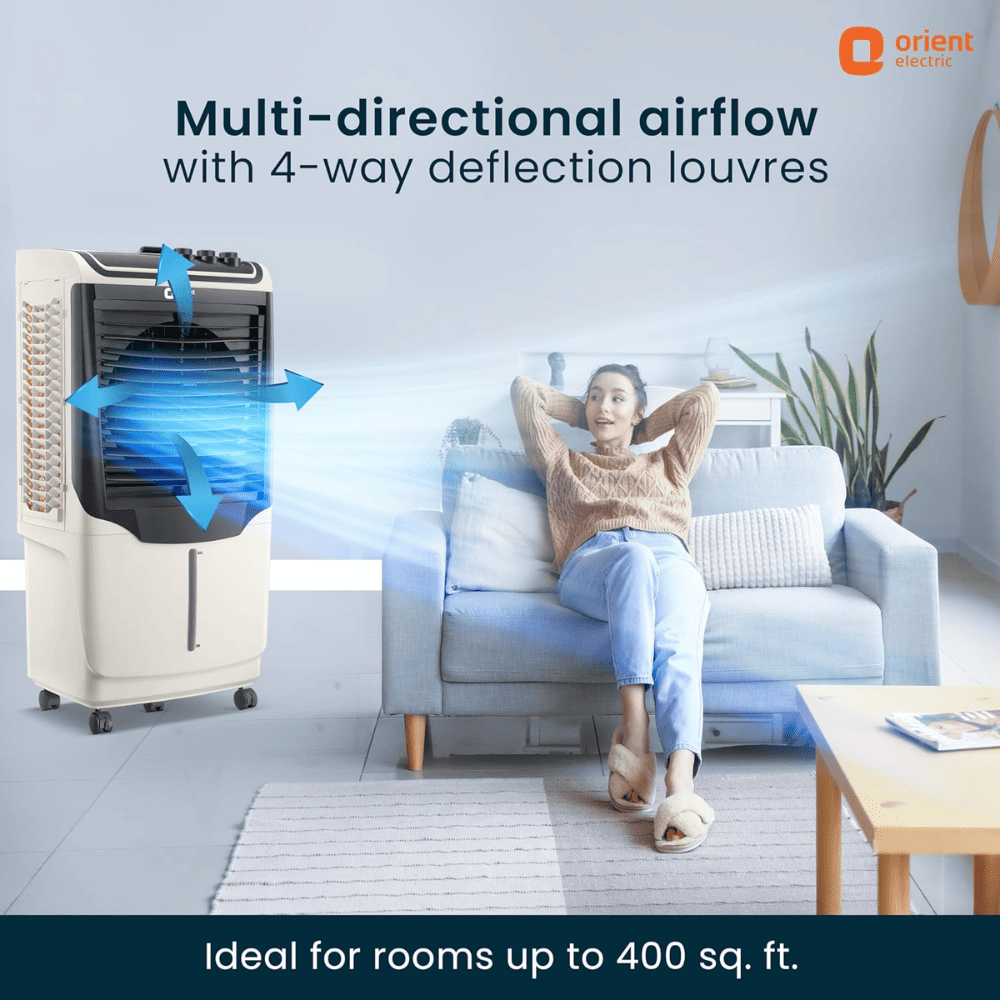 - Long Air Throw : Thanks to its air throw of up to 17.98 m (59), the Orient Electric 105 L Desert Air Cooler is suitable for restaurants, homes, offices, and warehouses. This way, it ensures cool and comfortable surroundings.