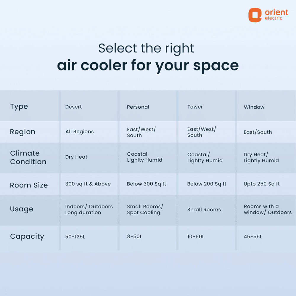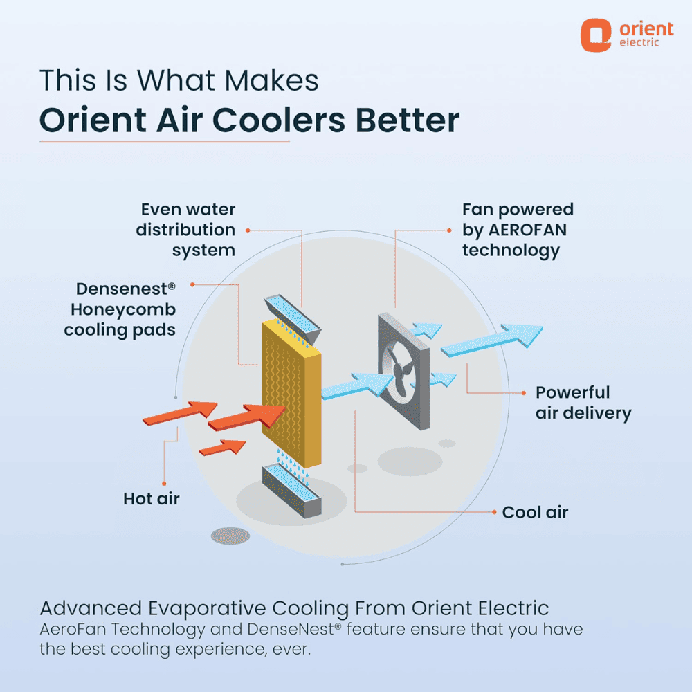 - The Orient Electric 105 L : You can enjoy peaceful and restful nights of sleep with Desert Air Cooler. With an air throw reaching up to 17.98 m (59), this air cooler is well-suited for a range of environments including homes, restaurants, offices, and warehouses. Its air delivery capability, up to 4,500 cubic meters per hour, ensures a refreshing escape from the intense heat, especially during hot summer days. Additionally, using special Densenest honeycomb pads, this air cooler keeps water well, which helps it work effectively all the time