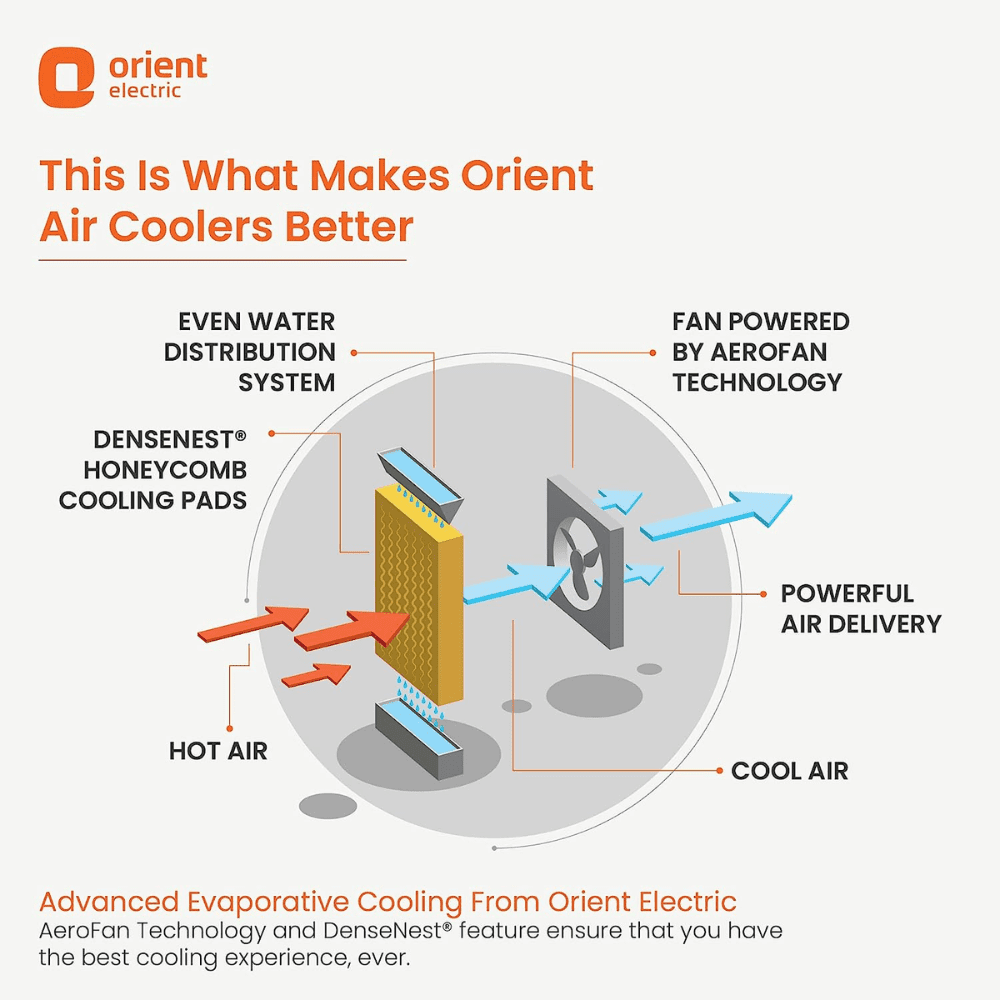 - 25% MORE COOLING, 45% MORE WATER RETENTION: Equipped with DenseNest honeycomb cooling pads, this air cooler for home ensures rapid and enhanced cooling performance for a long duration