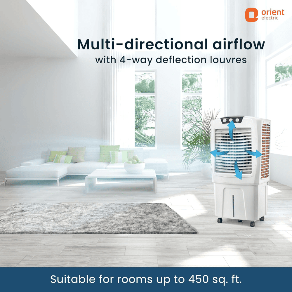 - Long air throw: Designed for superior air throw that reaches up to 54 feet, the air cooler is ideal for homes, offices, and restaurants alike. This air cooler is suitable for rooms up to 450 square feet.