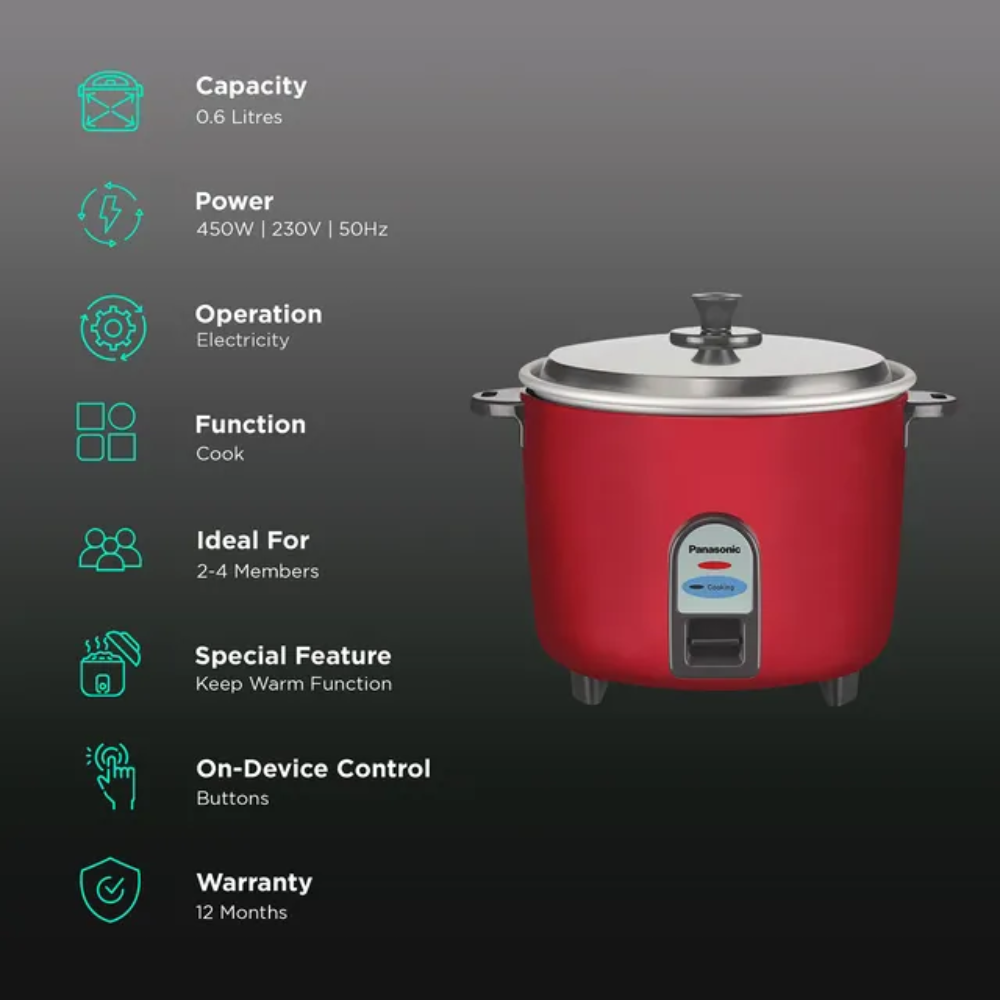 - Panasonic presents rice cooker made of metal in burgundy colour. This cooker is of 4.4 litres in capacity and keep away from corrosive liquids