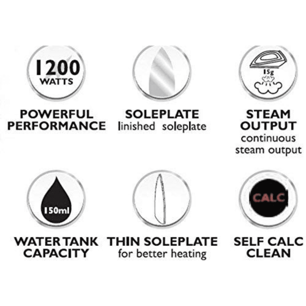 - Linished soleplate. Continuous steam output 15 g/min. Fast & powerful crease removal