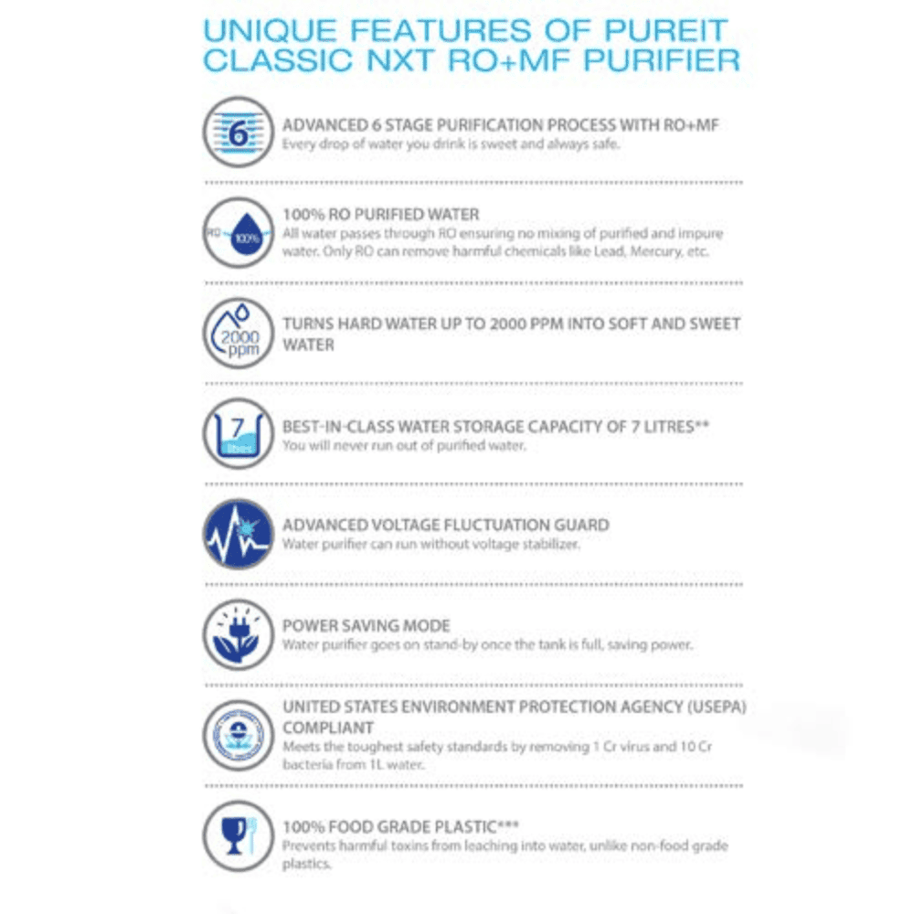 Hindustan Unilever’s Pureit, World’s largest selling water purifier company, presents Classic Nxt RO+UV which guarantees safe and sweet RO water at an unbelievable price. Its best in class water storage capacity of 7 Litres coupled with attractive, space saving design and advanced 6 stage purification makes this RO purifier a perfect fit for your family. Extremely compact and sleek device that fits in any kitchen. Pureit gives the best in class 7 litres1 storage, so you always have instant access to safe and sweet water throughout the day even during power failures.