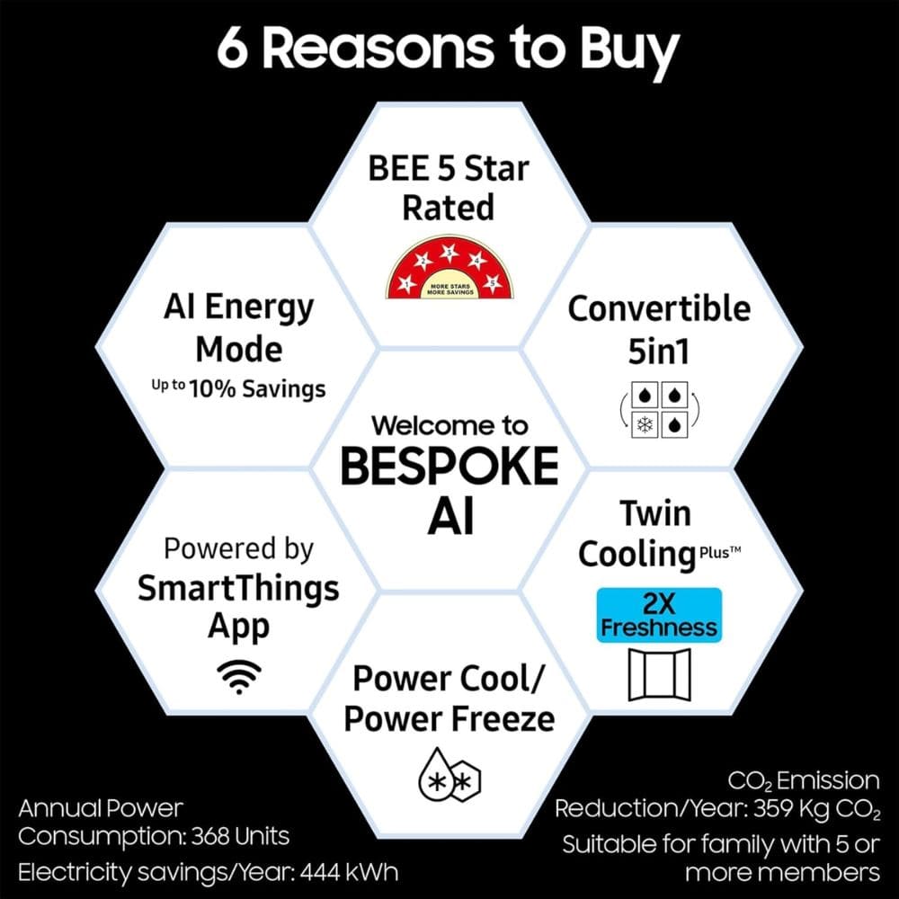 - Special Features : Bespoke AI, Auto Open Door, Glass Door, Convertible 5-in-1 | Twin Cooling Plus| Wi-Fi Embedded | Smart Things App | Smart Things AI Energy Mode | Power Freeze | Power Cool | Fingerprint Resistant | Built-in Look