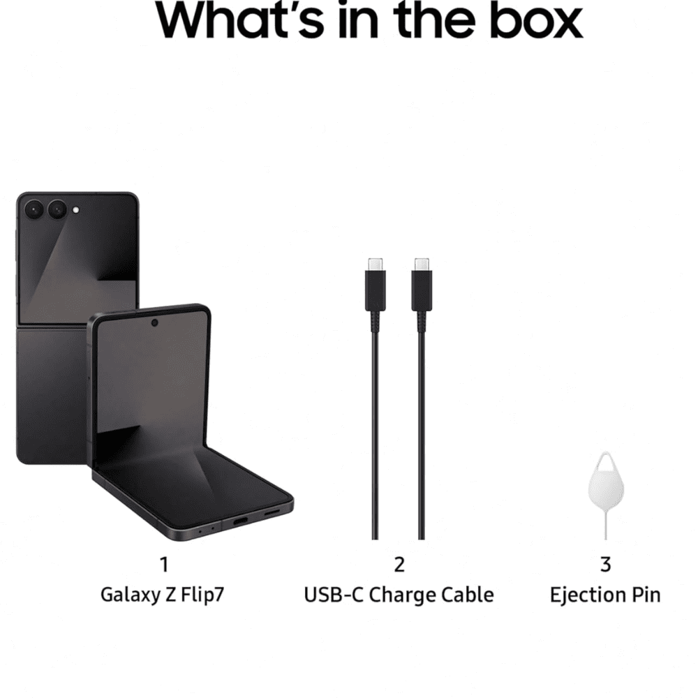 Handset, Data Cable (C to C), Sim Ejection Pin, Quick Start Guide, Protection Film (Main Screen Only)