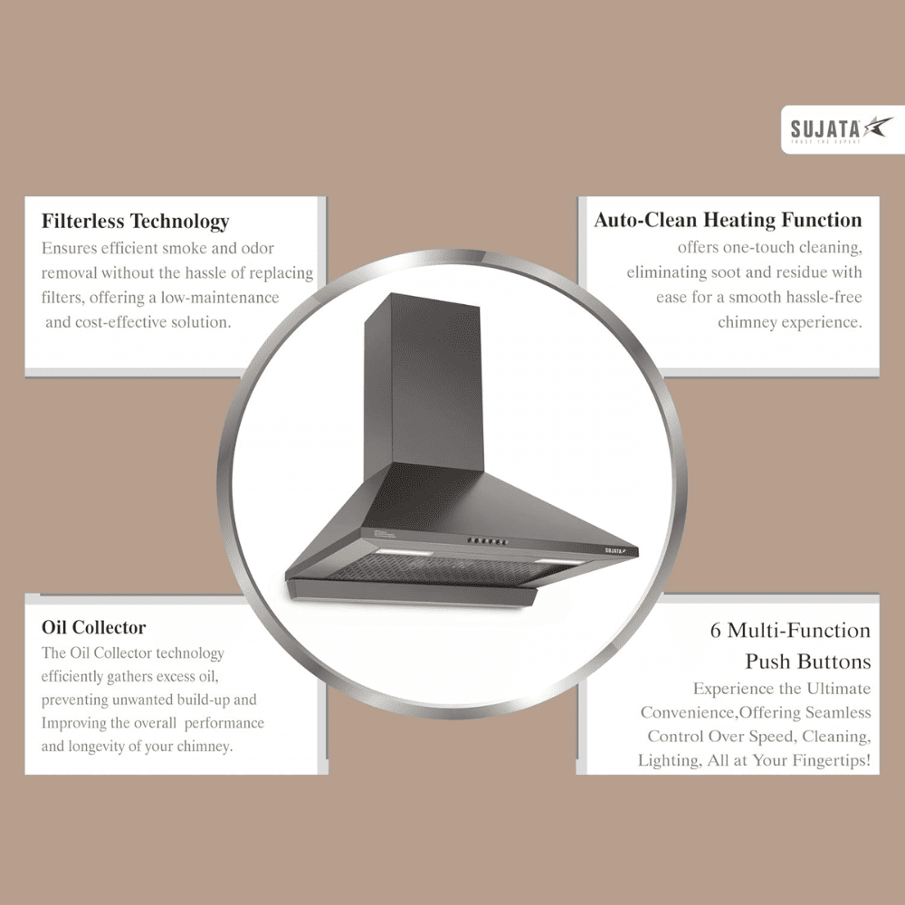 Sujata Onyx, 60 cm 1250m3/hr Autoclean Kitchen Chimney with Filterless Technology (Black)