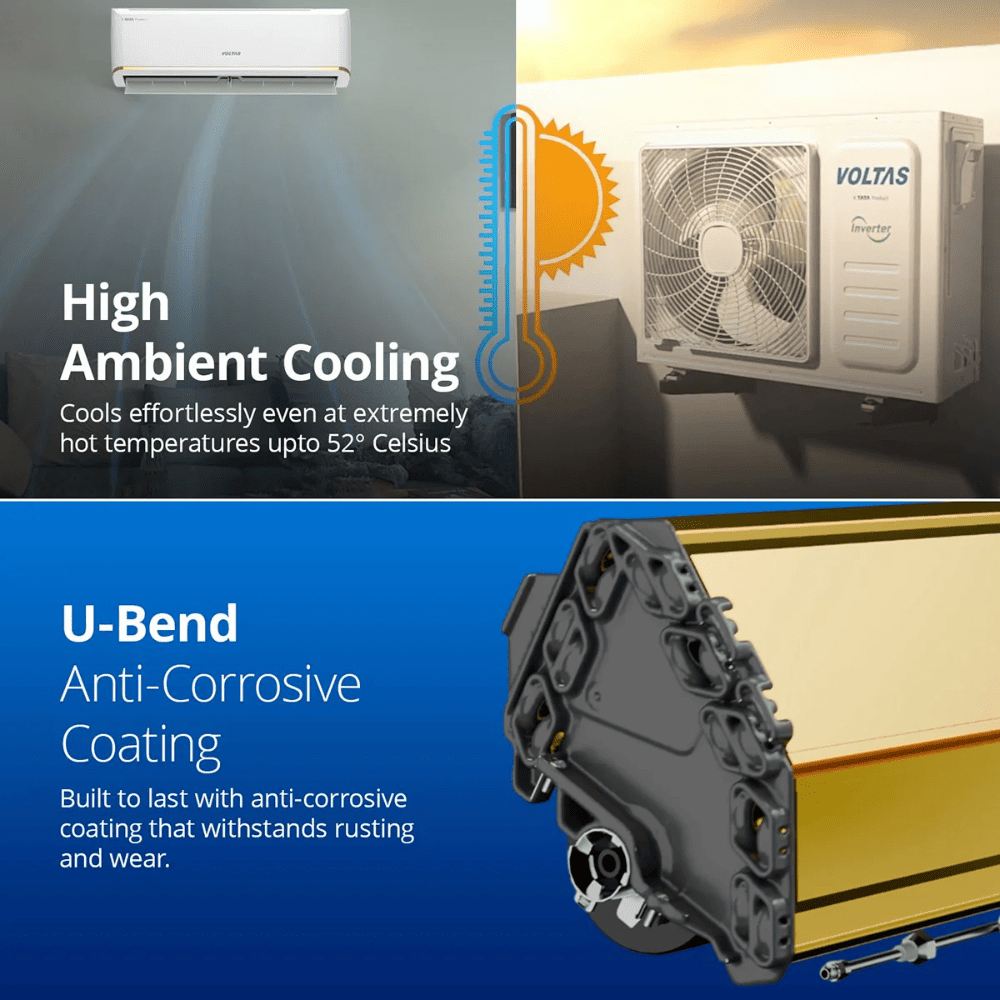 - The Voltas Adjustable Inverter Split AC has a sleek curved design and a big indoor unit to ensure powerful airflow, Built to handle extreme 52°C temperatures, it keeps you cool, always.