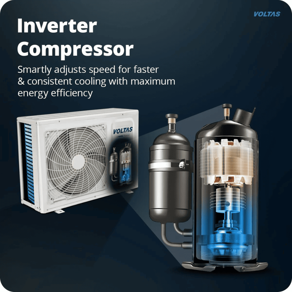 - Split AC with inverter compressor: Variable speed compressor which adjusts power depending on heat load. Convertible / adjustable with 4 cooling modes through remote control to operate in different tonnages for different cooling needs
